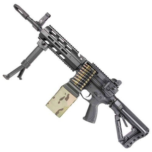 Comments: Unleash hell with G&G's latest addition to the Combat Machine series. The CM16 LMG (light machinegun) has a hybrid design that can be carried like a standard M16 or mounted for sustained fire. It comes with a 2500rd box magazine with a camo cover and a link of dummy rounds for added realism. Internally equipped with a MOSFET and ETU, this AEG has outstanding trigger response and can be programmed for 3-round burst. Batteries and charger not included.