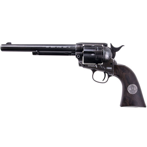 Comments: Stand up for your right to bear arms with this limited edition NRA model Colt Peacemaker pellet gun. This 1:1 scale replica of the iconic Single Action Army revolver features custom NRA trademarks and engravings. The weathered metal frame displays the gun's original patent dates and the handle has a verse from the second amendment engraved on the backstrap.